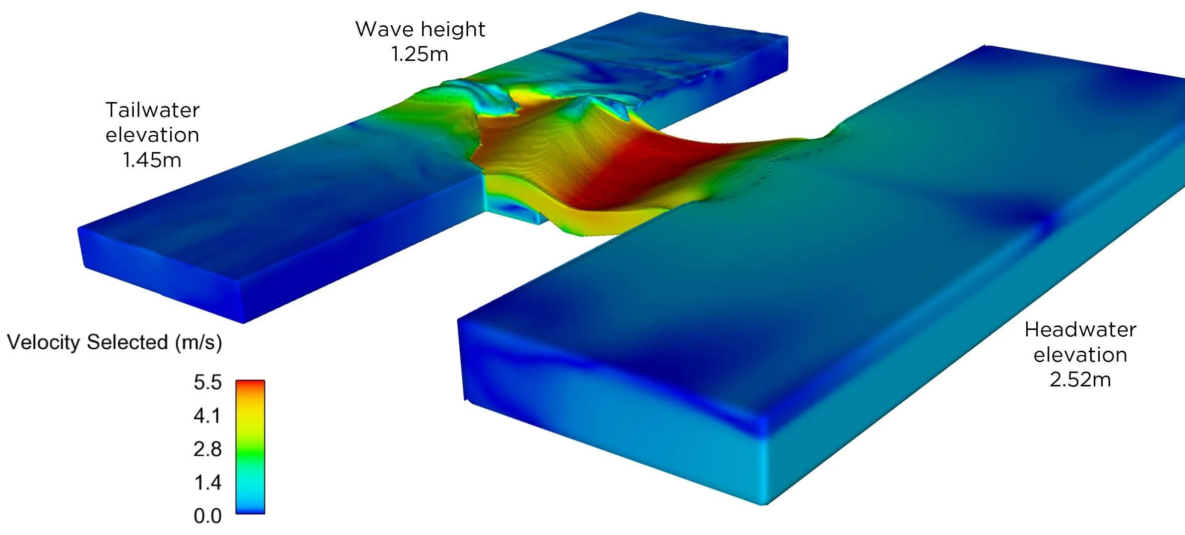 A wide range of waves types will be made. The adjustable wave plans are the result of an 18 month research project by ARSA, AWA, Surf Anywhere, the University of Ottawa, and MITACS. An adjustable wave will provide excellent surf waves and kayak waves all year including during high flows. Below are some of the waves created during modelling, the waves in the model are 1m wide.