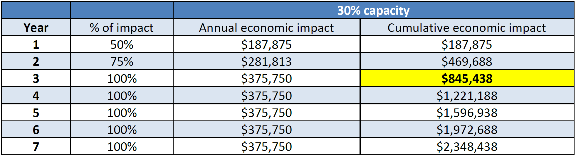 The “Economic impact report for Kananaskis adjustable wave” shows a conservative return on investment of about 2.3 years. This return is based on:
